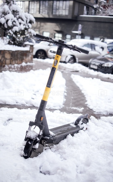Электрический скутер, припаркованный в снежной городской среде, демонстрирует зимние условия и проблемы городской мобильности в холодный сезон