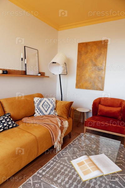 Уютная гостиная со стильным оранжевым диваном, украшенным декоративными подушками, современной лампой и стеклянным кофейным столом, создает теплую и гостеприимную атмосферу для отдыха