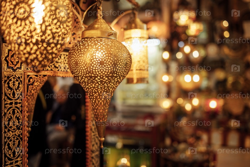 Декоративные золотые фонари, висящие на оживленном рынке, бросают сложные тени на окружающие стены, создавая теплую и привлекательную атмосферу для покупателей и посетителей