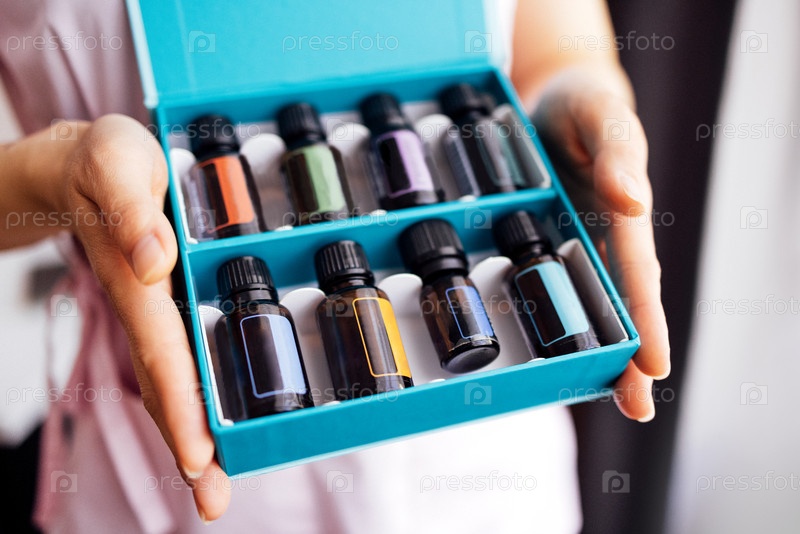 Коллекция бутылок эфирного масла в синей коробке, которую держит человек и на которой изображены различные цвета и этикетки, представляющие ароматерапию и оздоровительные практики для релаксации и исцеления