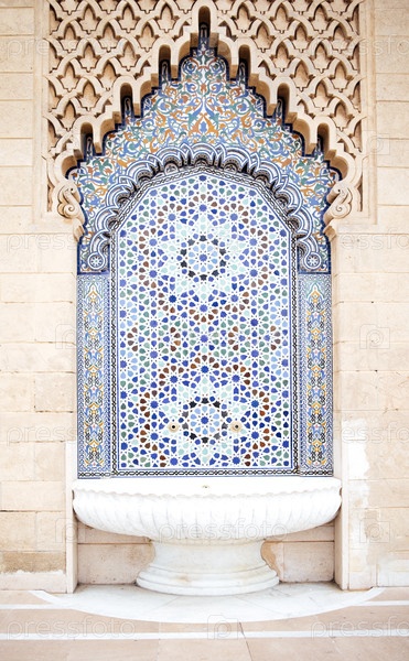 Декорированный фонтан из черепицы со сложными геометрическими узорами и яркими цветами, установленный на текстурированной каменной стене, демонстрирующий традиционное мастерство и архитектурную красоту