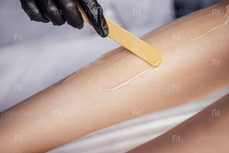 Женщина-эстетик, выполняющая процедуру удаления волос с использованием воска и деревянной лопатки на гладкой коже ног, демонстрируя профессиональную косметическую терапию и методы личной гигиены