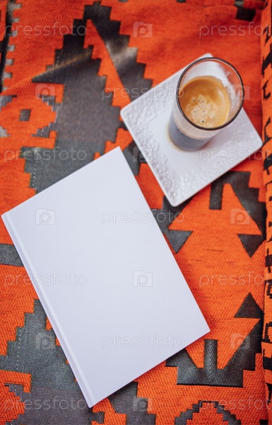 Пустой блокнот, лежащий на яркой ткани с узором рядом со стаканом кофе на белой тарелке, создает уютную атмосферу для письма или творческого вдохновения