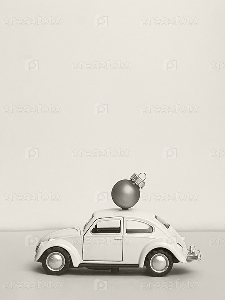 Миниатюрный автомобиль с рождественским украшением на синем фоне