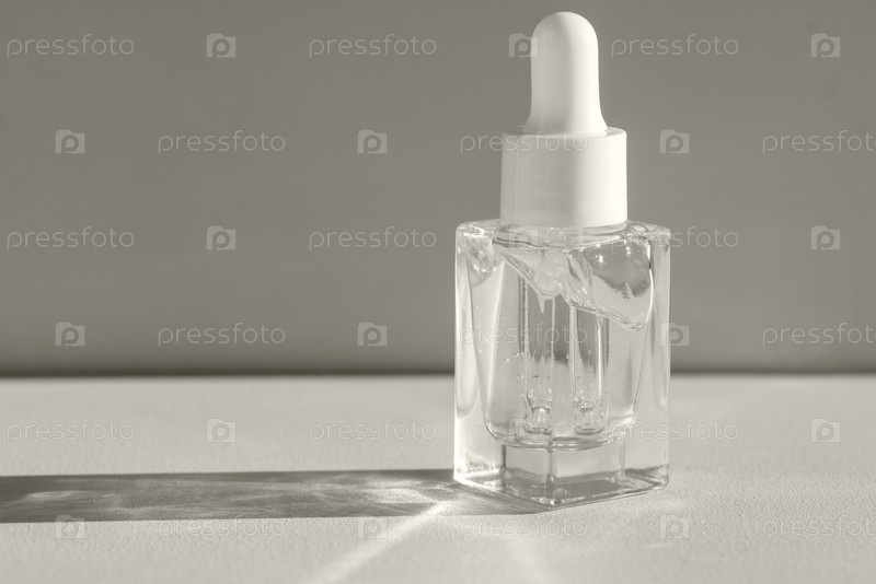 Закрытие прозрачной стеклянной бутылки с увлажняющей сывороткой и пипетой под ярким солнечным светом
