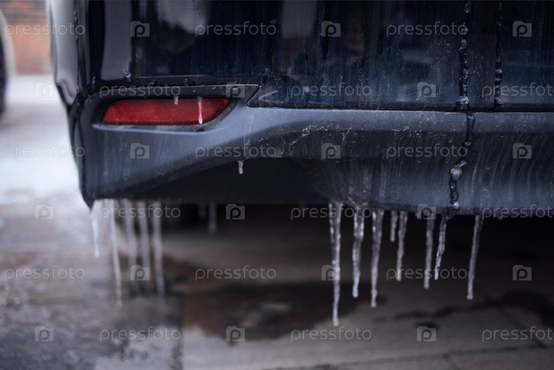 Вид на задний бампер автомобиля с ледниками, демонстрирующими зимние условия и влияние холодной погоды на транспортные средства в гараже