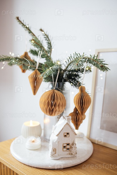 Праздничные праздничные украшения с декорациями соломинки и вечнозелеными ветвями в стеклянной вазе, со свечами и декоративным домом на деревянном столе, создавая теплую сезонную атмосферу