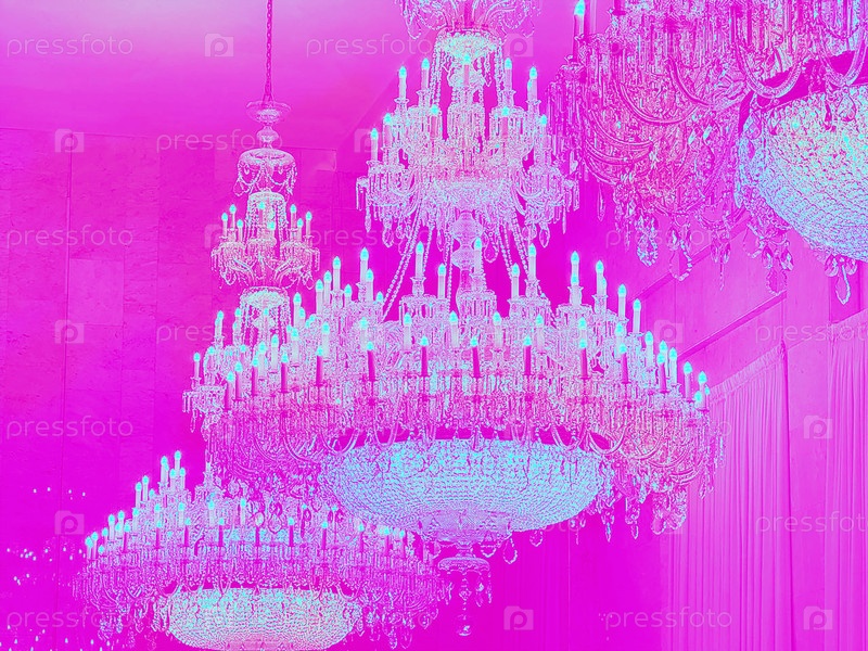 Элегантные хрустальные люстры, освещенные ярко-розовыми оттенками, создают роскошную атмосферу в величественном пространстве, показывая сложные узоры и сверкающие детали