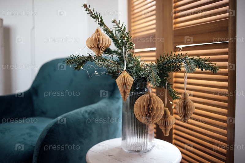 Декоративная композиция вечнозеленых ветвей и клеточных орнаментов в стеклянной вазе на мраморном столе рядом с мягким бирюзовым креслом, создавая уютную атмосферу