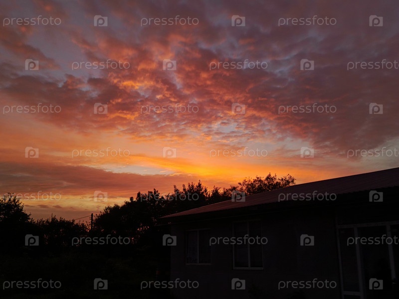Красивый закат с розовыми оттенками над сельским пейзажем вечером