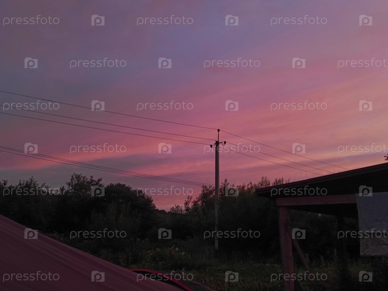Красивый закат с розовыми оттенками над сельским пейзажем вечером