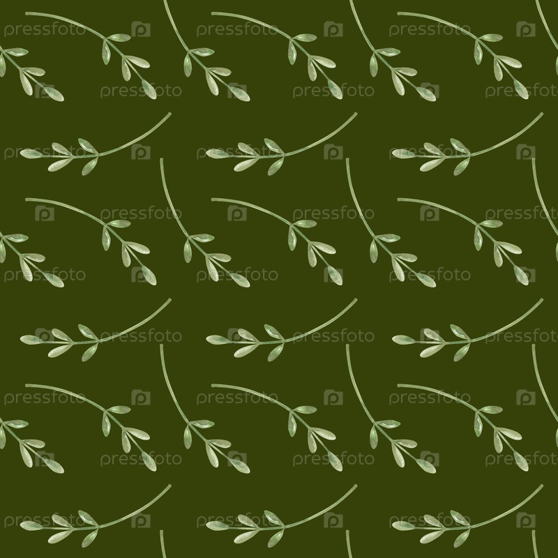 Бесшовный рисунок с тонкими зелеными ветвями на темно-зеленом фоне. Ботанический орнамент с листьями. Минималистский бесшовный фон для обертывания бумаги, обоев, текстиля