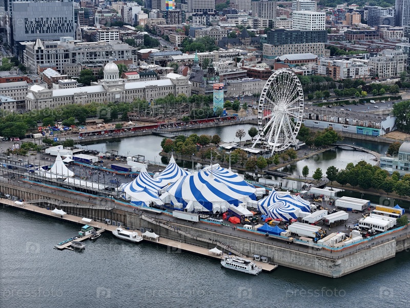 Полет беспилотника 24 августа 2025 года над сине-белой цирковой палаткой в Старом порту Монреаля на фоне городского пейзажа