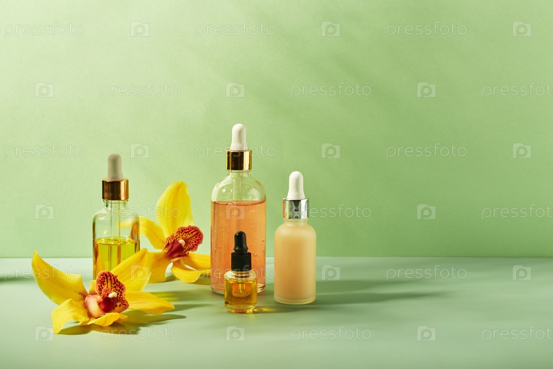Продукты косметического ухода в стеклянных бутылках с цветами орхидеи - сыворотка, крем, гель, масло. Концепция по уходу за лицом и телом, спа-центр, тропическая релаксация. Косметика на цветном фоне с твердыми тенями