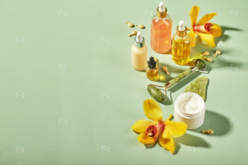 Продукты косметического ухода в стеклянных бутылках с цветами орхидеи - сыворотка, крем, гель, масло. Концепция по уходу за лицом и телом, спа-центр, тропическая релаксация. Косметика на цветном фоне с твердыми тенями