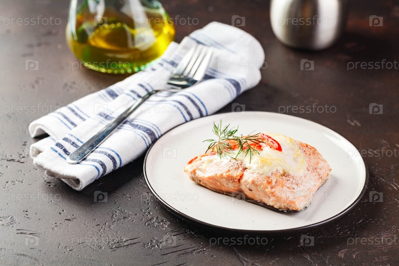 Выпеченный лосось (атлантический лосось) под сливочным соусом, украшенный укропом и куском перца. обеденный стол с разнообразными блюдами, комплексное меню для питательного и здорового ланча в ресторане, бизнес-лунч