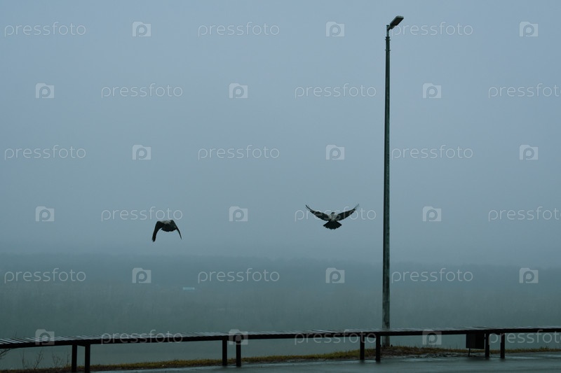 Туманный пейзаж с двумя птицами в полете