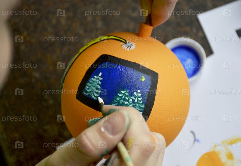 Женские руки тщательно красят рождественский шар яркими оранжевыми оттенками