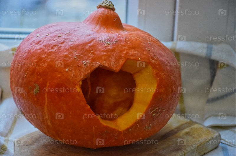 Оранжевая тыква на режущей доске, дыра в форме сердца