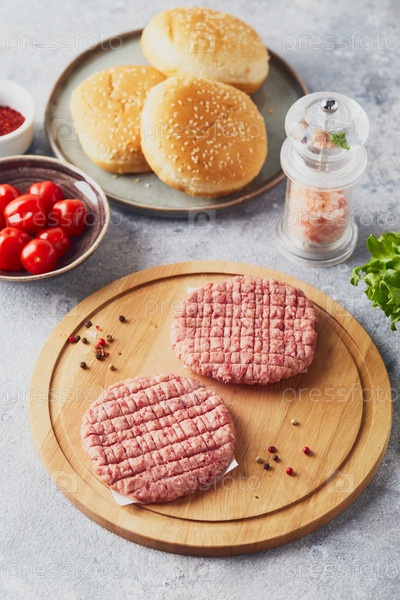 Сырое теленочное мясо, стейк-котлеты на деревянной доске