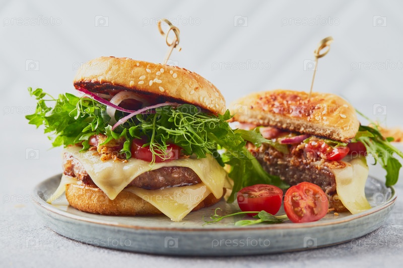Два бургера с телячьим котлетом и травами на деревянной доске для резки