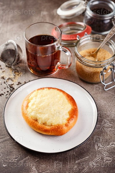 Торт с дрожжевым тестом на блюде и чашке чая