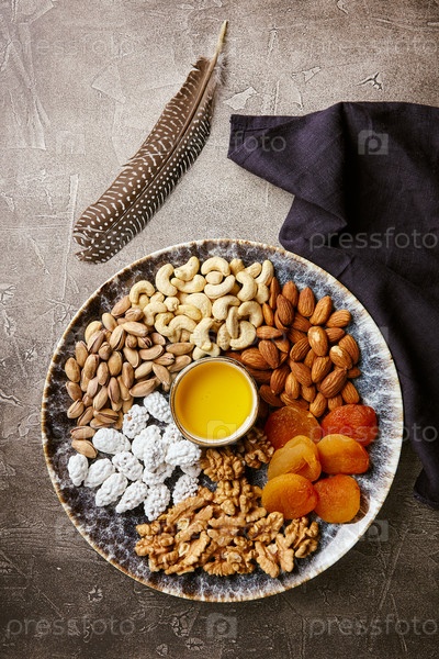 Ассортимент орехов и сухофруктов в восточном стиле на блюде: сушеные абрикосы, кешью, фисташки, миндаль и грецкие орехи