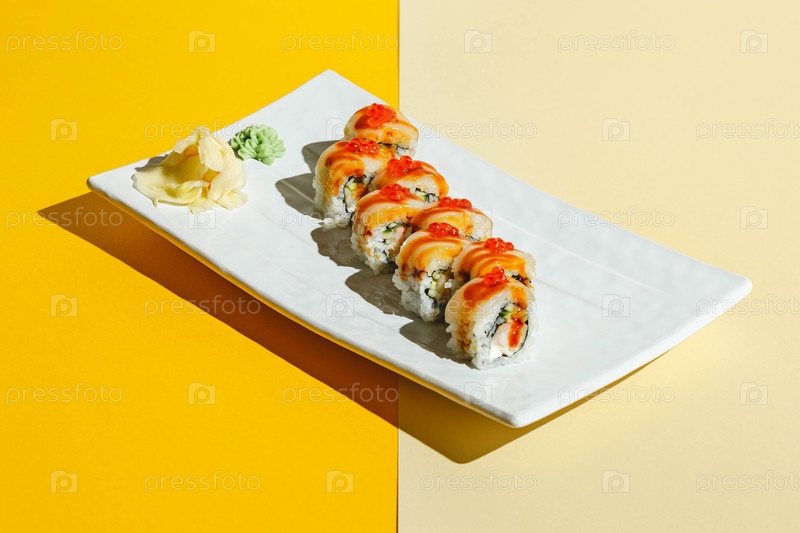 Рулоны суши с угорьем, креветками, огурцом и сливочным сыром, украшенные красным хайваром