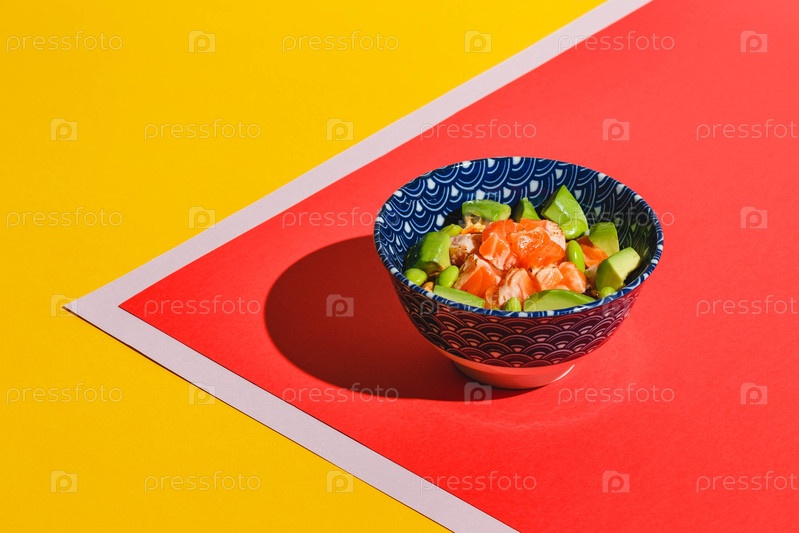 Встряхните миску с рисом, авокадо, бобами эдамаме и копченым лососем