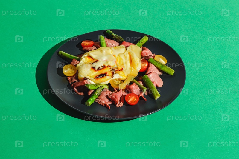 Вкусный сыр-ракета подавался за жареным говядиной с помидорами и спаржами.Твердый свет, глубокая тень