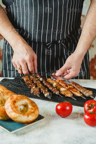 Шиш-кебаб или кебаб на косточках, жареный в руках повара.Традиционное блюдо азиатской кухни