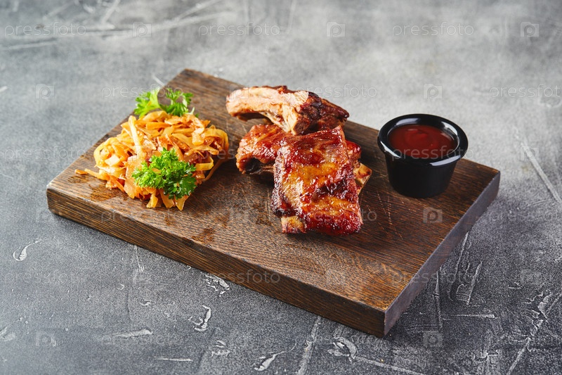 Свинские ребра на гриле с кетчупным соусом на деревянной доске