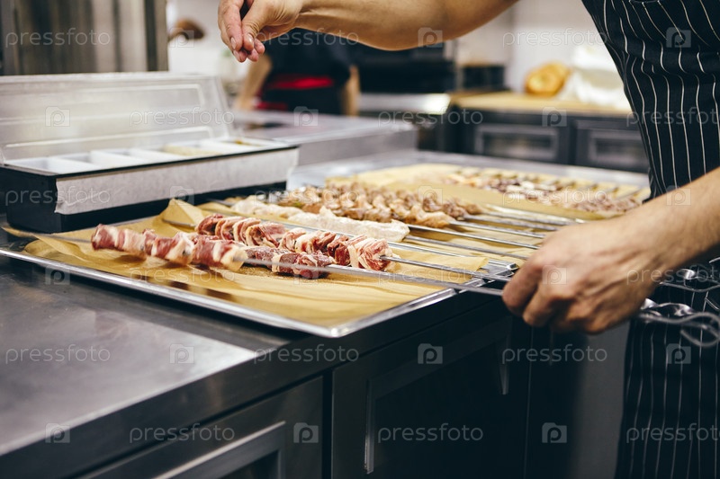 Различные виды мяса на кебабах для выпечки кебабов на гриле в кухне ресторана
