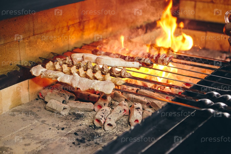 Шиш-кебаб на кебабах из разных видов мяса, жареных в кухне ресторана
