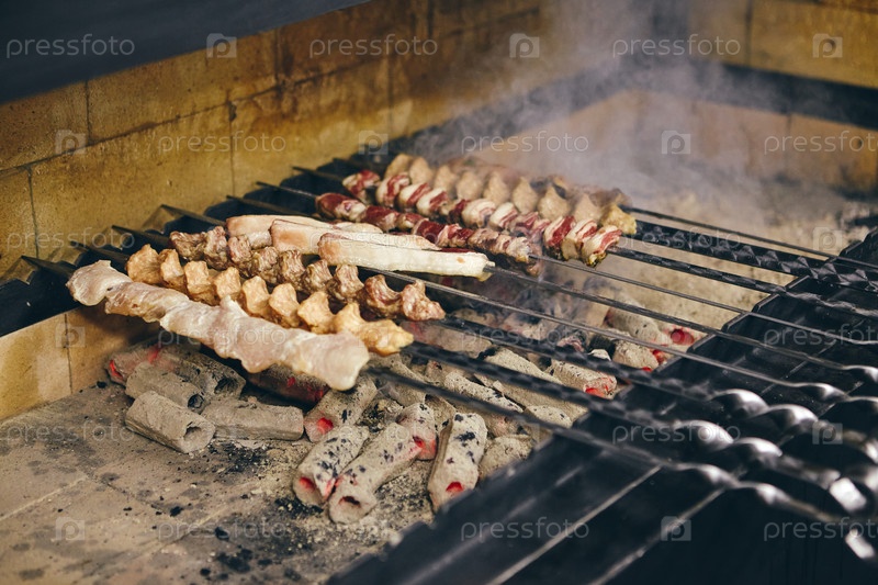 Шиш-кебаб на шашлыках из различных видов мяса жарят на гриле в кухне ресторана
