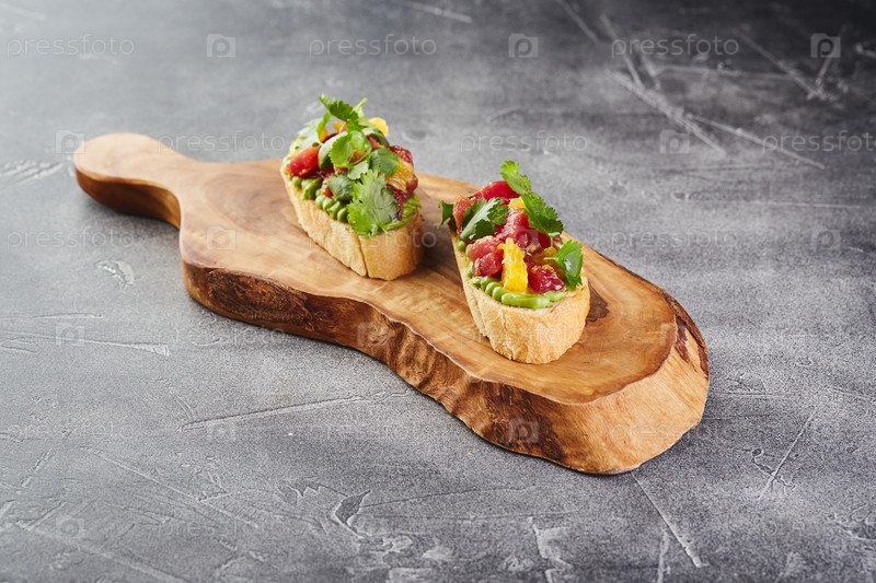 Два брюскетта с макаронами авокадо, тунцом, апельсином и кориандром на деревянной доске для резки на сером фоне