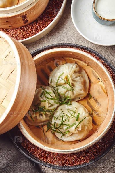 Традиционное азиатское национальное блюдо манта, manta или manti, похожее на пельмени, приготовленное в бамбуковом пароварке