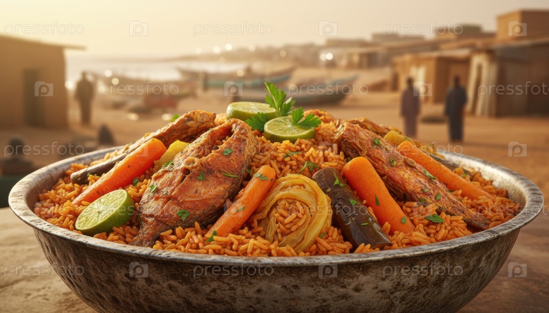 Сенегальское рисовое блюдо с рыбой и овощами, известное как thieboudienne, подается рядом с рыбацкой деревней в солнечный день