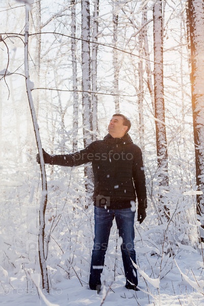 Человек потрясает дерево снегом в заснеженном лесу в солнечный день