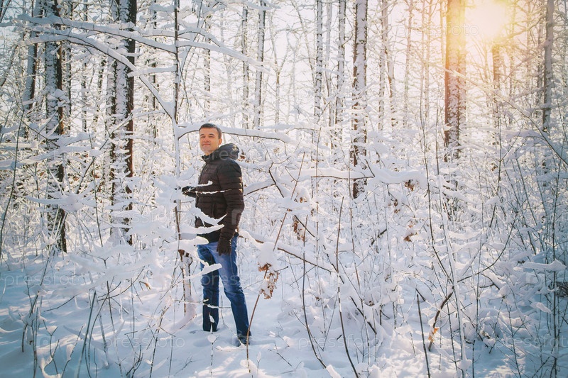 Человек потрясает дерево снегом в заснеженном лесу в солнечный день