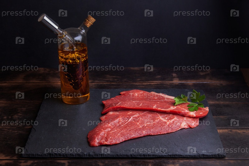 Стейк из мраморной говядины на сланцевой доске, бутылка с растительным маслом и бальзамическим уксусом