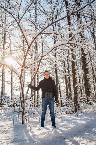 Человек потрясает дерево снегом в заснеженном лесу в солнечный день