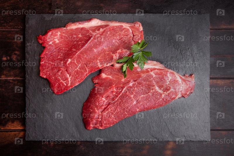 Стейк с говядиной из мраморного сырья минуты с листом петрушки на каменном доске