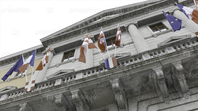 Дом с флагами разных стран, развевающимися на ветре, вид снизу.Винтажная архитектура со современными дрожащими флагами на здании