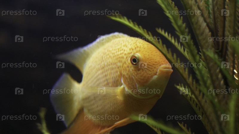 Близкий снимок золотой рыбки в аквариуме с зелеными растениями, концепция домашнего питомца. Красивая золотая рыбка открывает рот и движет плавниками рядом со зелёными водорослями