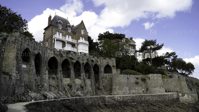 Древняя прибрежная крепость с арками и тропой на фоне возвышающейся современной коттеджной деревни