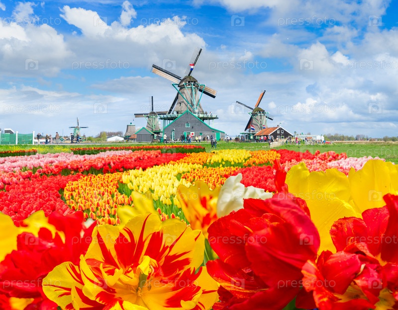 Голландская ветряная мельница над тюльпанами