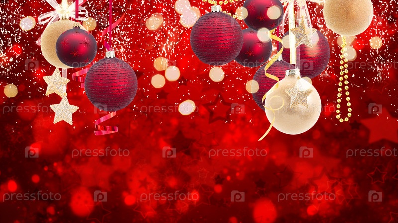 Близкие гирлянды красных рождественских шаров на праздничном светящемся фоне