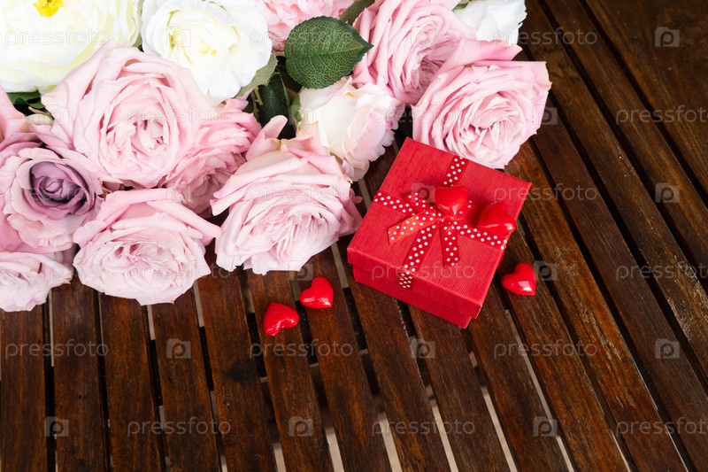 Букет цветущих розовых роз в коробке для подарков, фон на День святого Валентина