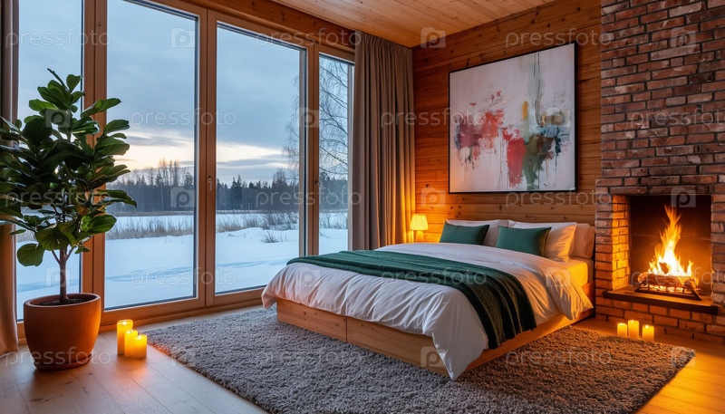 Интерьер уютной спальни для романтических выходных. камин, свечи, панорамные окна, коттедж, отель. созданный искусственным интеллектом
